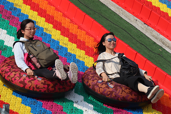 繽紛絢麗的七彩旱滑道上,波浪起伏,回旋前進,平日里工作一本正經的同事們也拋開了包袱盡情歡笑尖叫,從七彩旱滑劃過,仿佛心情也沾染了繽紛的顏色,明媚張揚。