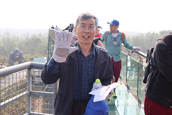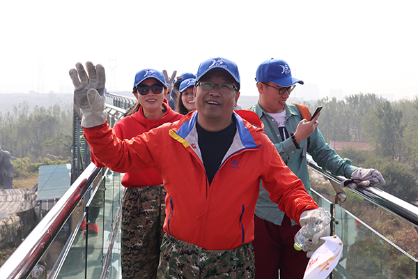 還未從回旋的刺激中緩過神,大家就已經暈暈乎乎的站上了玻璃棧道,走在橋上,腳下的青山綠水清晰可見,四周清風拂面,仿佛凌空漫步,立足云間,有人三五成群拍照留念,也有人抓緊救命的欄桿戰(zhàn)戰(zhàn)兢兢,更有同事將玻璃橋走成了獨木橋,踩著金屬支架,小心前行。