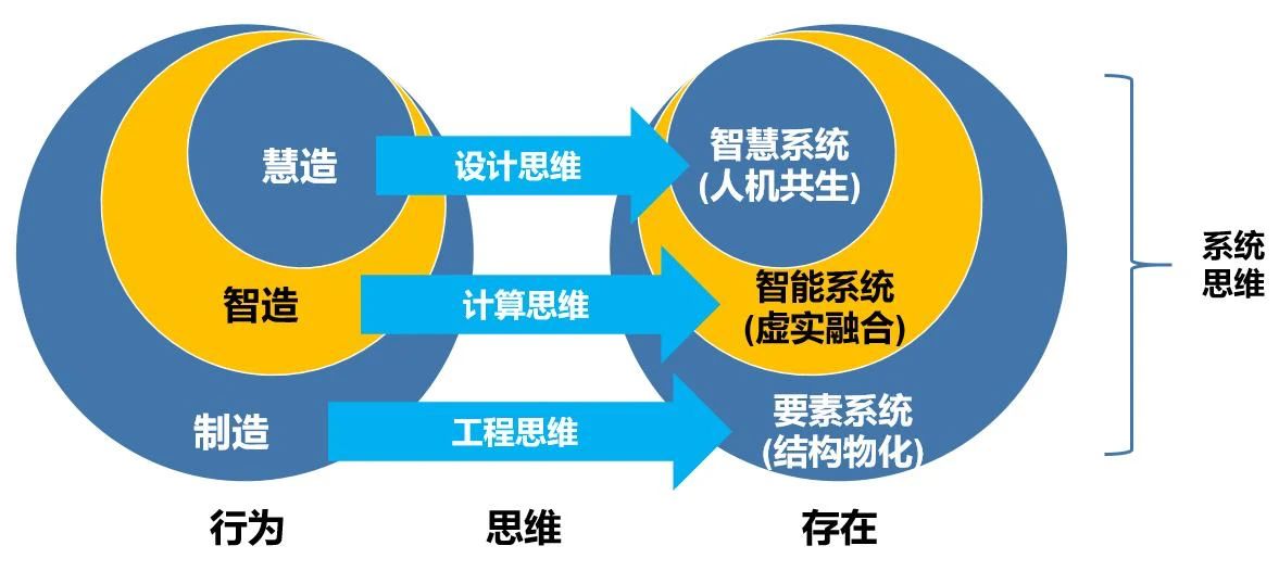 作為人工智能素養(yǎng)最為內在的部分,人工智能思維起到了目標定向的作用,極為重要。那么,何謂人工智能思維?作為當代科學技術發(fā)展的結晶,人工智能在改造人們生產生活方式的過程中也塑造了人們的行為方式和思維方式。當我們以人工智能塑造的終極樣態(tài)為起點逆向考察人類系統(tǒng)的演進過程,這本身就可以讓我們獲得一種寶貴的系統(tǒng)思維,并可以找到智慧系統(tǒng)、智能系統(tǒng)和傳統(tǒng)的要素系統(tǒng)三種不同的系統(tǒng)形態(tài)(存在方式),而每一種系統(tǒng)形態(tài)的塑造都離不開關鍵的生產行為及支撐這些行為的思維方式——慧造(設計思維)、智造(計算思維)和制造(工程思維)。