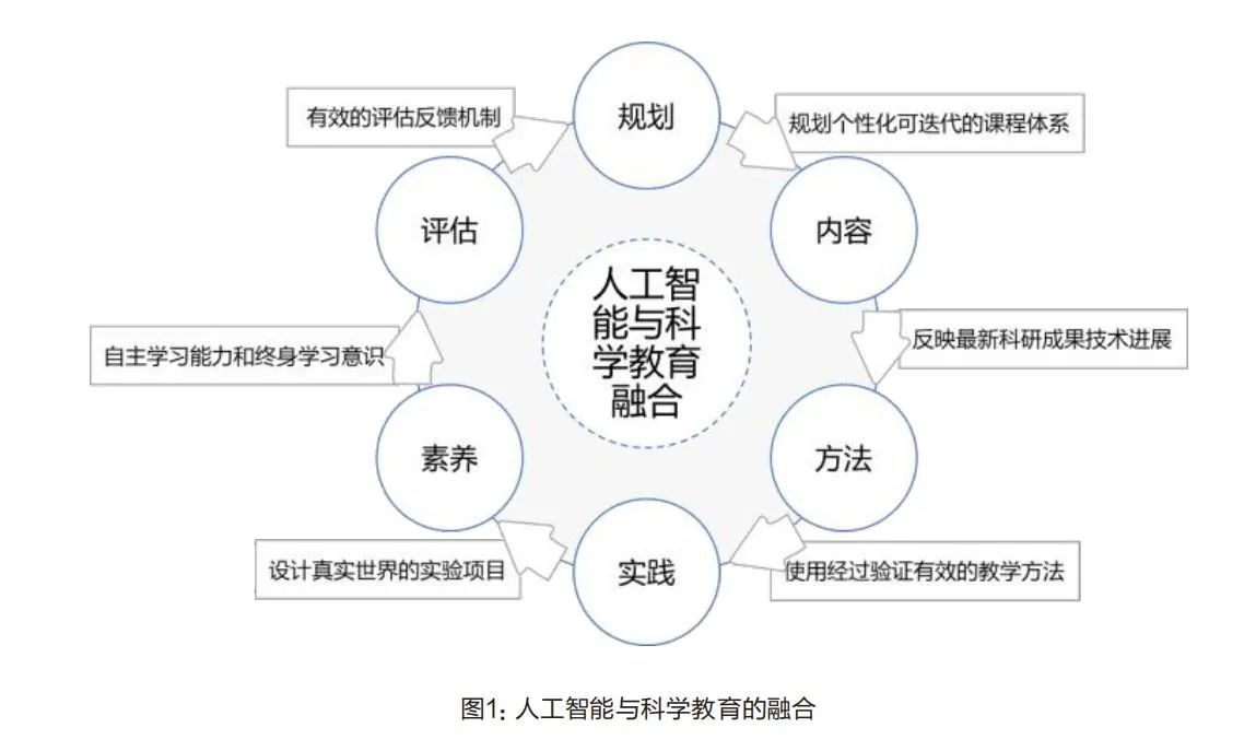 人工智能教育作為科學教育的一部分,其教學內容和教學活動應按照科學教育的目標和方法展開,需要在規(guī)劃、內容、方法、實踐、素養(yǎng)、評估等多個方面進行全面考慮和系統(tǒng)設計(如圖1所示)。一要規(guī)劃個性化可迭代的課程體系;二要確保教材和教學內容反映最新的科研成果和技術進展;三要采用經過驗證的教學方法,如項目式學習、探究式學習和翻轉課堂等,確保教學的有效性;四要設計真實世界的實驗項目,讓學生學會解決實際問題;五要通過實踐培養(yǎng)學生的自主學習能力和終身學習意識;六要建立有效的評估反饋機制,及時收集學生、家長和教師的意見建議,不斷調整和優(yōu)化教學方案。