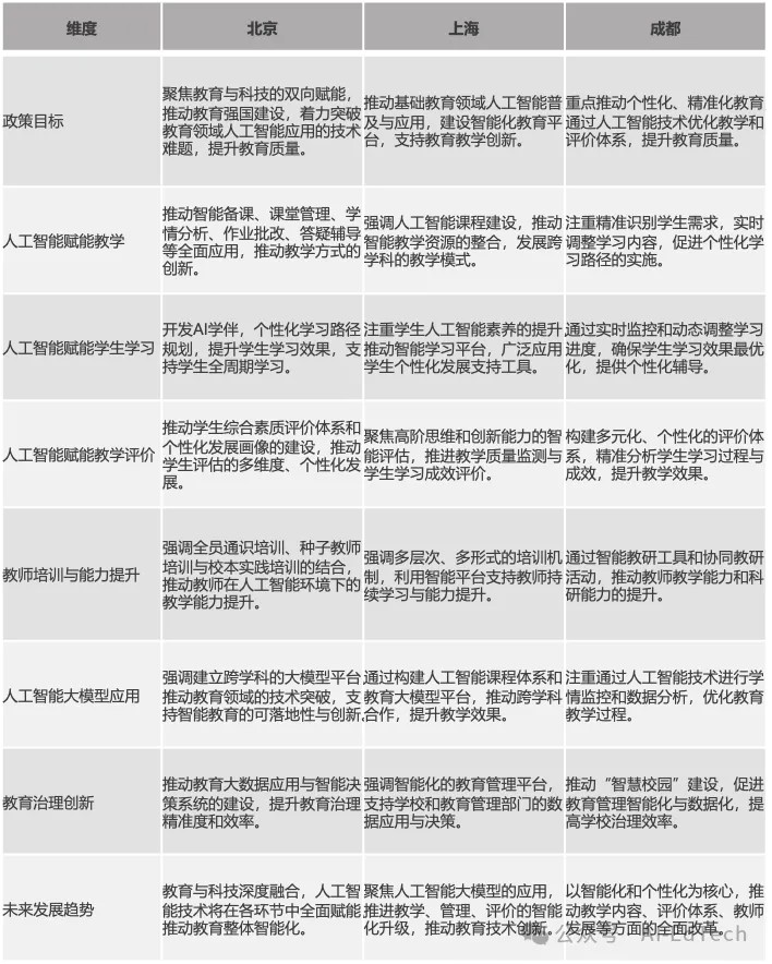 此外,上海重點(diǎn)關(guān)注課程設(shè)置、教學(xué)資源共享,并積極推動(dòng)學(xué)校與外部科研、企業(yè)的合作支持,致力于打造全面的智能教育生態(tài)。