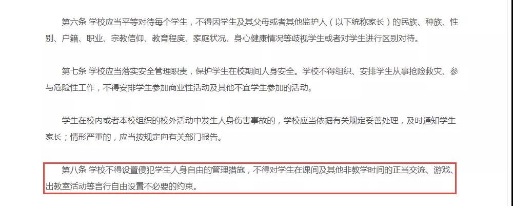 第八條 學(xué)校不得設(shè)置侵犯學(xué)生人身自由的管理措施,不得對(duì)學(xué)生在課間及其他非教學(xué)時(shí)間的正當(dāng)交流、游戲、出教室活動(dòng)等言行自由設(shè)置不必要的約束。