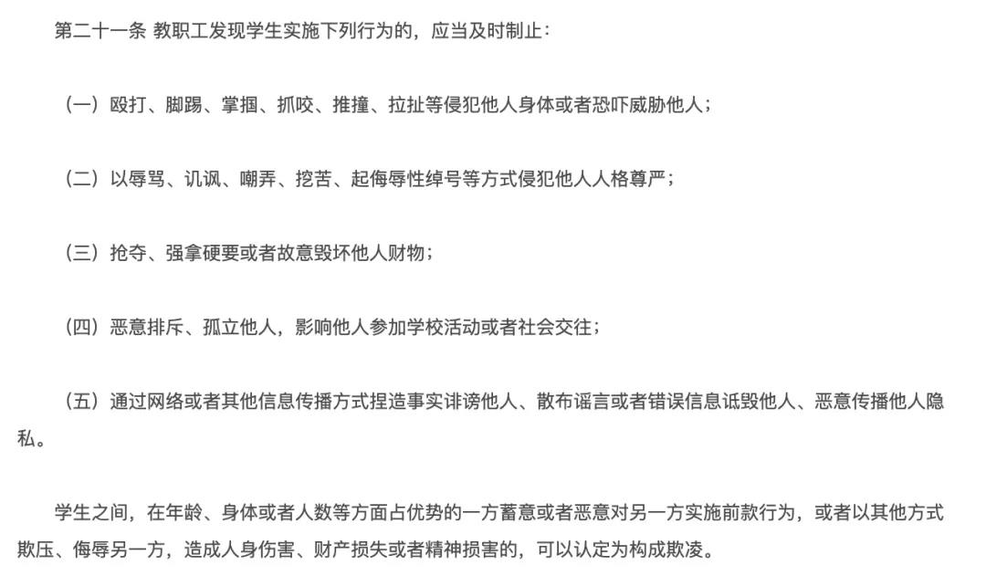 《未成年人學(xué)校保護(hù)規(guī)定》明確了欺凌的概念,要求學(xué)校應(yīng)當(dāng)定期針對(duì)全體學(xué)生開展防治欺凌專項(xiàng)調(diào)查,對(duì)學(xué)校是否存在欺凌等情形進(jìn)行評(píng)估,并歸納了侵犯身體、侮辱人格、侵犯財(cái)產(chǎn)、惡意排斥、網(wǎng)絡(luò)誹謗或傳播隱私等以下五類欺凌行為: