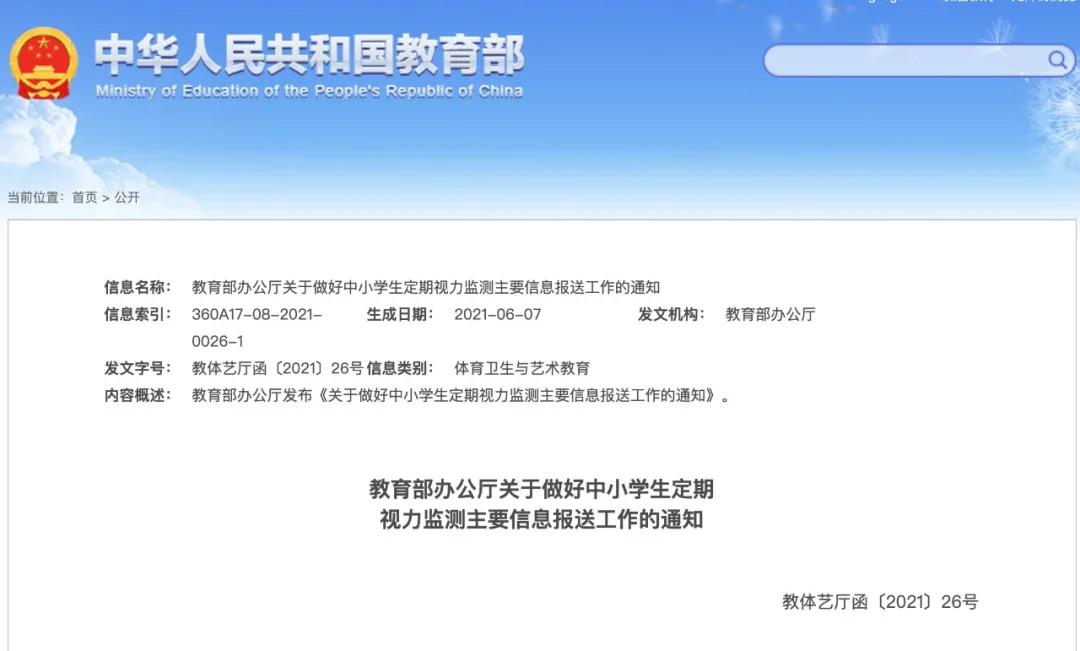 6月3日,教育部印發(fā)《關(guān)于做好中小學(xué)生定期視力監(jiān)測(cè)主要信息報(bào)送工作的通知》,切實(shí)落實(shí)學(xué)生健康體檢制度和視力監(jiān)測(cè)制度。