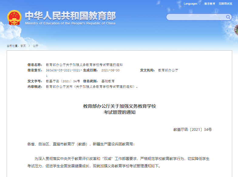 為深入貫徹落實中央關(guān)于教育評價改革和“雙減”工作部署要求,嚴(yán)格規(guī)范學(xué)校教育教學(xué)行為,切實降低學(xué)生考試壓力,促進(jìn)學(xué)生全面發(fā)展健康成長,現(xiàn)就加強(qiáng)義務(wù)教育學(xué)??荚嚬芾硗ㄖ缦?。