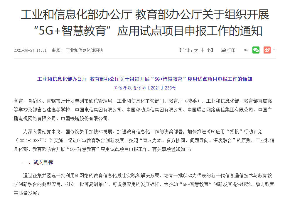為深入貫徹黨中央、國務(wù)院關(guān)于加快5G發(fā)展、加強教育信息化工作的決策部署,加快推進《5G應(yīng)用“揚帆”行動計劃(2021-2023年)》實施,促進5G與教育融合創(chuàng)新發(fā)展,按照“育人為本、多方協(xié)同、問題導(dǎo)向、深度融合”的原則,工業(yè)和信息化部、教育部聯(lián)合開展“5G+智慧教育”應(yīng)用試點項目申報工作。有關(guān)事項通知如下: