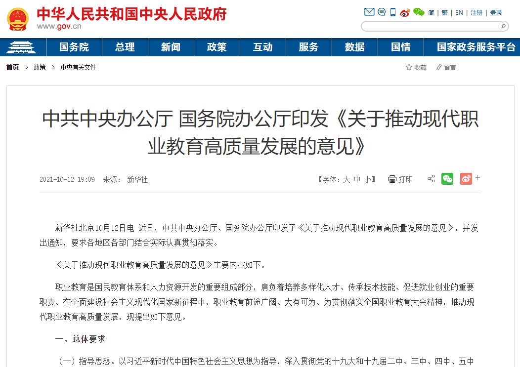《關(guān)于推動(dòng)現(xiàn)代職業(yè)教育高質(zhì)量發(fā)展的意見》主要內(nèi)容如下。