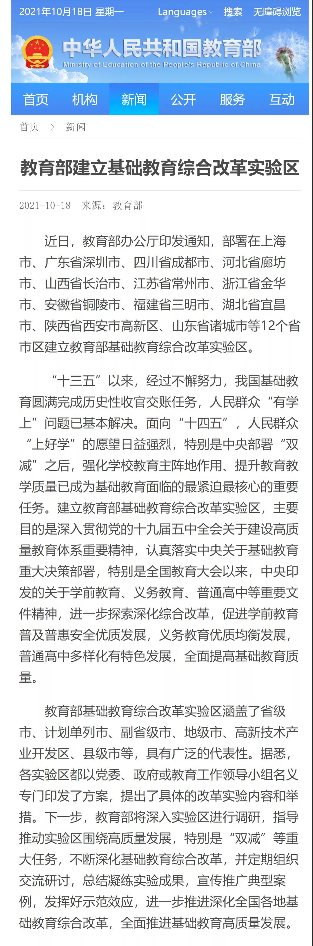 教育部就“建立基礎(chǔ)教育綜合改革實(shí)驗(yàn)區(qū)”進(jìn)行權(quán)威發(fā)布