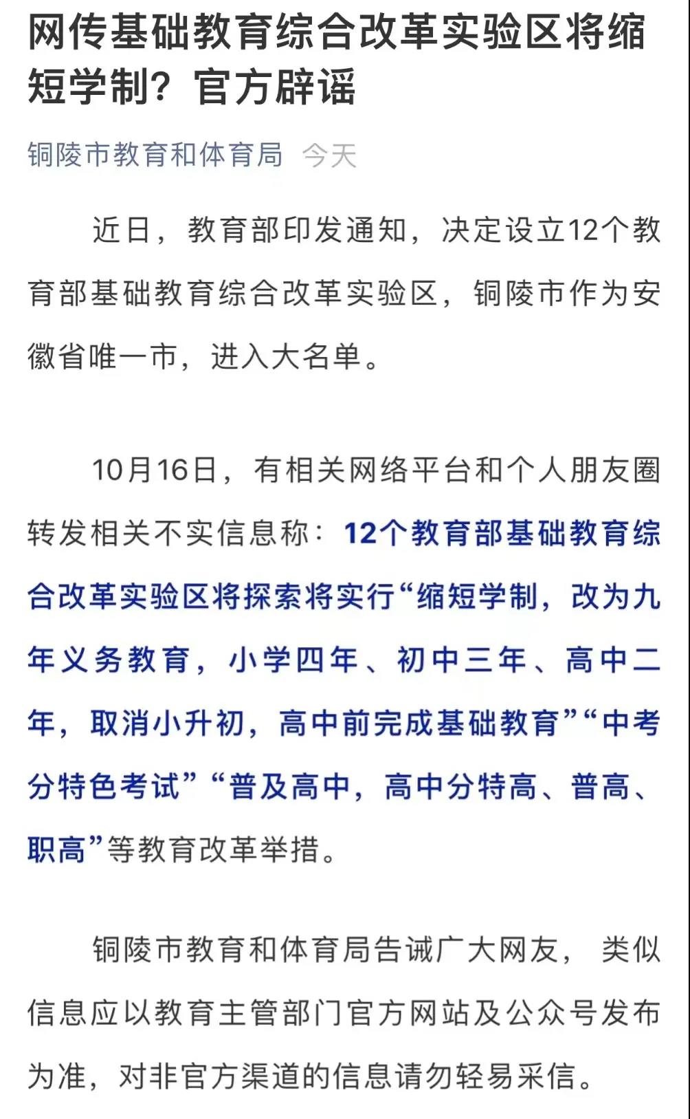安徽省銅陵市教體局官方辟謠
