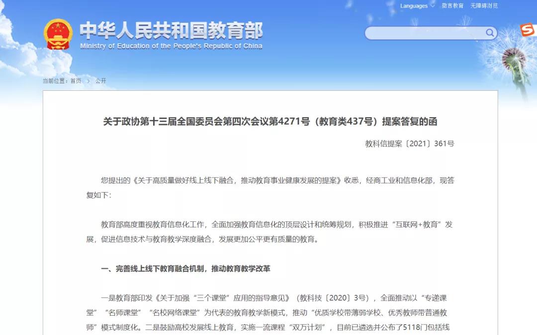 日前,教育部官網發(fā)布對政協第十三屆全國委員會第四次會議第4271號(教育類437號)提案(《關于高質量做好線上線下融合,推動教育事業(yè)健康發(fā)展的提案》)答復的函。教育部在答復中表示,高度重視教育信息化工作,全面加強教育信息化的頂層設計和統(tǒng)籌規(guī)劃,積極推進“互聯網+教育”發(fā)展,促進信息技術與教育教學深度融合,發(fā)展更加公平更有質量的教育。具體內容快跟著多考合一系統(tǒng)的小編看看吧~
