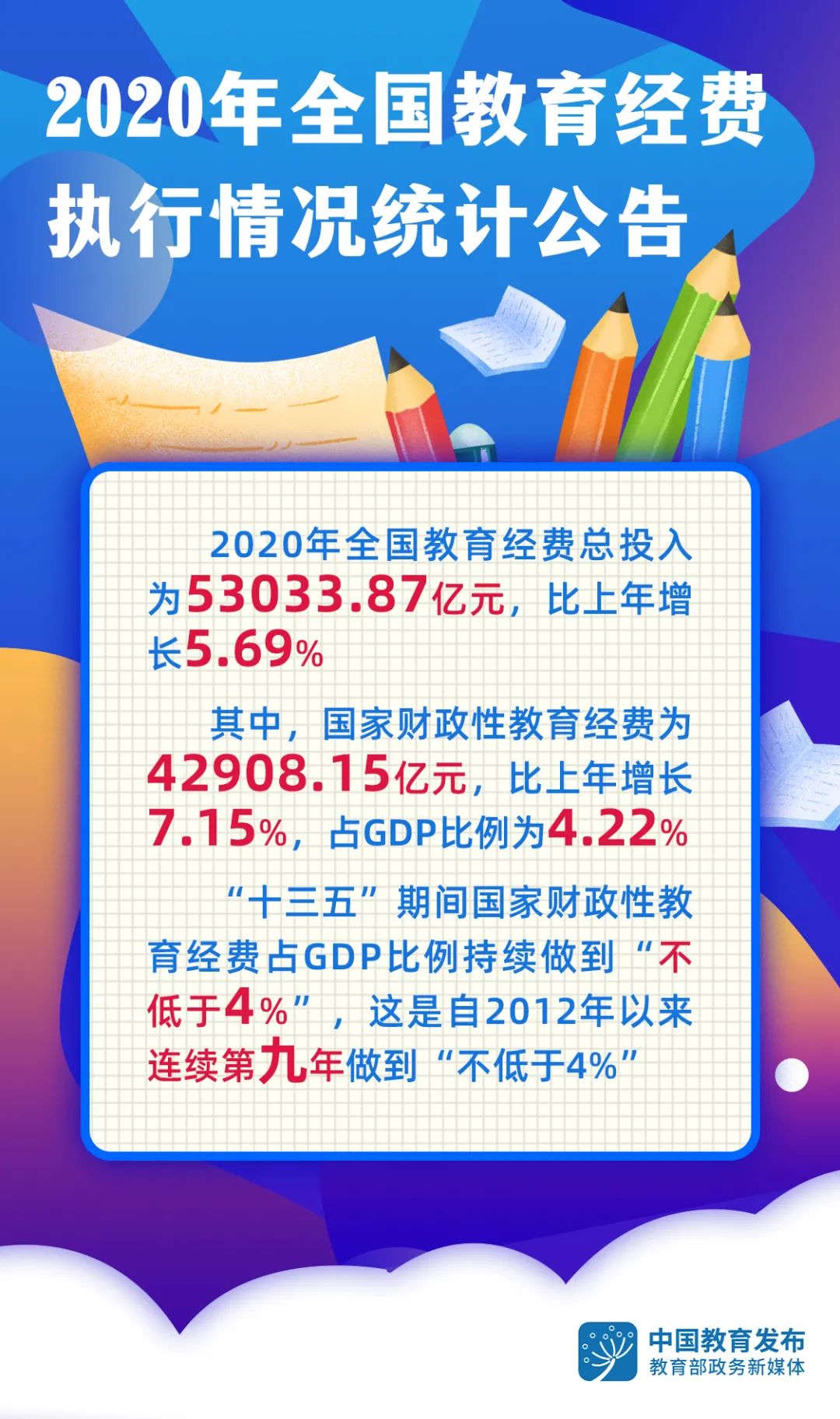 教育部、國家統(tǒng)計(jì)局、財(cái)政部近日發(fā)布了《關(guān)于2020年全國教育經(jīng)費(fèi)執(zhí)行情況統(tǒng)計(jì)公告》(以下簡稱“《公告》”)?!豆妗凤@示,2020年全國教育經(jīng)費(fèi)總投入為53033.87億元,比上年的50178.12億元增長5.69%。