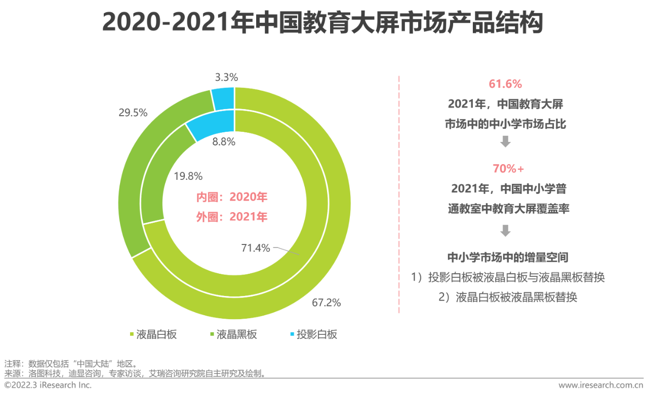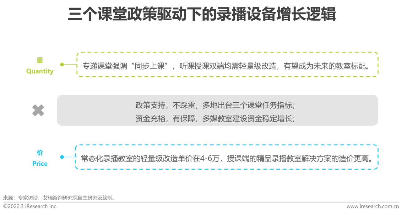 我國中小學多媒體教室覆蓋率高,2020年,校均多媒體教室數(shù)量占教室總數(shù)量達96.1%,未來的增量空間主要來自存量教室的設(shè)備保有量提升及設(shè)備的更新?lián)Q代。分產(chǎn)品來看,1)教育大屏內(nèi)部呈現(xiàn)結(jié)構(gòu)性變化??偭糠矫妫行W依舊是中國教育大屏市場的主陣地(占比超六成),但大屏解決方案的高滲透率及頭部玩家的高度集中讓更多廠商將重點投向其他教育階段(幼教、職教、高教),2021年,中國教育大屏市場中,中小學的市場份額同比下降超過10pct。結(jié)構(gòu)方面,在需求端設(shè)備升級與供應(yīng)商創(chuàng)收壓力的雙向驅(qū)動下,顯示效果更好,單價更高(平均高于同檔次液晶白板10-20%),毛利更豐厚的液晶黑板成為大小廠商的主推產(chǎn)品,2)錄播設(shè)備成為政策驅(qū)動下的“香餑餑”。“三個課堂”政策下,各地提出了明確的建設(shè)指標,未來建設(shè)動能充足,與此同時,以“錄播主機、攝像頭、麥克風”為主要設(shè)備的解決方案整體造價更高,且與教育大屏同樣屬于聽授課雙端的常態(tài)化教學教室的多媒體改造工程,市場空間更大。