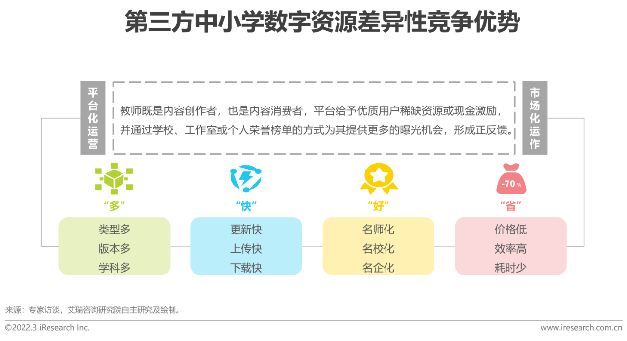 教育部反復強調(diào),要加快構(gòu)建“基礎(chǔ)性資源靠政策、個性化資源靠市場”的資源建設(shè)機制和“企業(yè)競爭提供、政府評估準入、學校自主選擇”的資源供給機制,基于此,資源稀缺性將成為中小學數(shù)字資源廠商實現(xiàn)商業(yè)化的基礎(chǔ)。從資源生產(chǎn)的角度來看,全國及地方性名師工作室與教研組是這類稀缺資源的主要生產(chǎn)者,其在命題與押題上有著豐富的經(jīng)驗,根據(jù)行業(yè)實踐,互聯(lián)網(wǎng)資源平臺和地方教輔企業(yè)與這類優(yōu)質(zhì)教師形成了長期穩(wěn)定的合作關(guān)系,市場化的平臺運作機制和內(nèi)容生產(chǎn)機制,讓這兩類廠商成為了中小學第三方數(shù)字資源的主要供給方;從資源需求剛性程度來看,根據(jù)前文調(diào)研,中學學段(特別是高中學段)對高質(zhì)量數(shù)字資源需求較大,考慮到校際教育差異,學校多主張基于自身情況,搭建校本化的資源庫,為在校中學生提供與升學考試強相關(guān)的優(yōu)質(zhì)數(shù)字資源。此外,升學剛需學段的學習時間極其稀缺,隨著數(shù)字資源標簽越來越豐富,能夠?qū)崿F(xiàn)“精準練習,鞏固提升”的智能化數(shù)字資源庫將贏得更多學校的歡迎。