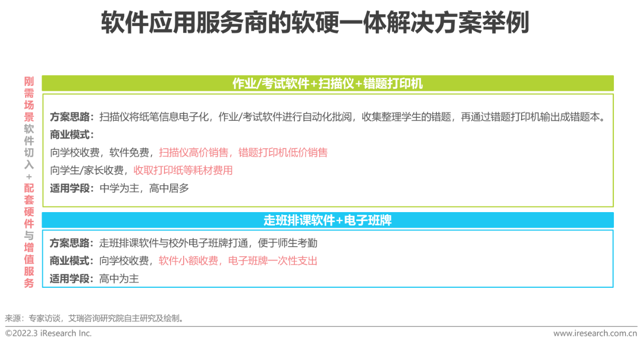 由于軟件類資產(chǎn)屬于無形資產(chǎn),在學校及教育部門審批過程中難以獲得較高的預(yù)算,導致我國中小學軟件服務(wù)的采購價格相對較低,廠商多采用先免費試用,后小額付費的方式進校,產(chǎn)品創(chuàng)收能力不足。目前,在軟硬一體的趨勢下,軟件廠商通過捆綁硬件的方式向?qū)W校交付整體解決方案,硬件“帶貨”能力更強,可以拉高單價,廠商和渠道端均能賺取利潤。在軟硬一體的方案當中,學生終端是最先被探索的整合品類,受制于我國復雜的商業(yè)環(huán)境性(詳細分析見“信息化終端”),中小學教師數(shù)據(jù)采集手段依舊以紙筆測驗為主,教師端成為了軟硬結(jié)合的突破口,作業(yè)考試場景下的掃描儀逐漸成為標配,并進一步演進為學生端共享的錯題打印機。此外,新高考提升走班排課復雜性與靈活性,排課軟件成為剛需,對于學生人數(shù)規(guī)模較大的高中,電子班牌的考勤打卡與滾動課表功能也進一步提升了教務(wù)管理的效率。