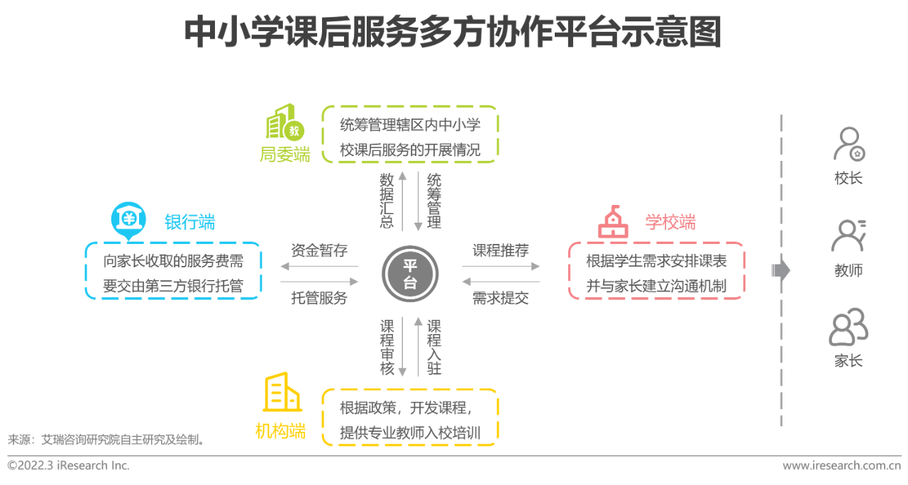 不同于其他教育管理信息化系統(tǒng),課后服務(wù)平臺橫跨多個模塊(資源、教務(wù)、評價)、多個組織(局委端、銀行端、學校端、機構(gòu)端)和多個用戶(校長、教師和家長),且需要在同一個平臺上將各個相關(guān)方進行統(tǒng)籌管理。具體來看,在教育資源方面,課后服務(wù)平臺需要結(jié)合學校級地方遴選進校供應(yīng)商的標準,為學校提供合法合規(guī)的潛在合作機構(gòu),這類機構(gòu)不僅要為學校輸出內(nèi)容,還應(yīng)當對學校教師進行培訓,確保課堂教學順利實施,實現(xiàn)特色課程常態(tài)化與校本化,豐富學校資源儲備,提升學校教學質(zhì)量。在教務(wù)管理方便,除常規(guī)的師生考勤以外,平臺還應(yīng)為學校提供與教育資源端打通的選班排課系統(tǒng),提升教務(wù)人員的組織管理效率,并與財務(wù)模塊聯(lián)動,保障資金的安全。在質(zhì)量評價方面,平臺應(yīng)基于需求端的真實反饋,形成課后服務(wù)的供給側(cè)退出機制,良性的競爭有助于提升機構(gòu)服務(wù)的供給質(zhì)量。