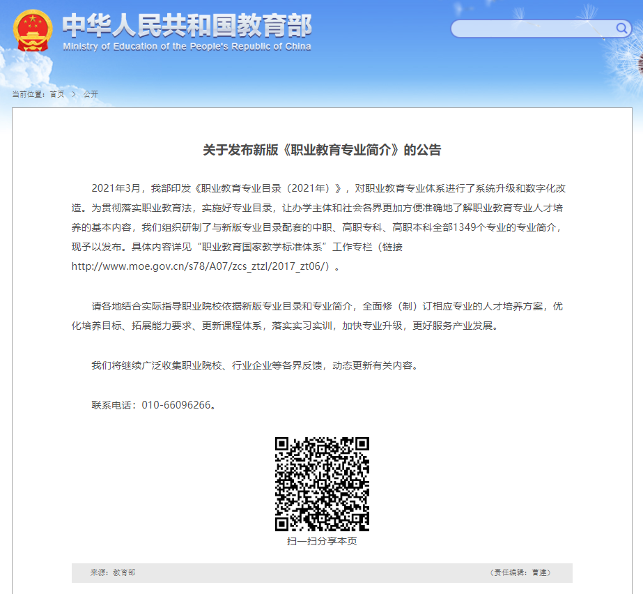 本次《簡介》研制過程中,教育部積極匯聚行業(yè)力量、充分發(fā)揮智庫作用,分析崗位需求、固化教改成果,組織上萬名專家學者共同研制;成稿過程中先后吸收中國科學院、中國工程院院士建議88條,吸收地方和行業(yè)部門意見5700余條?!逗喗椤烦浞煮w現(xiàn)了職業(yè)教育法新要求,全面展現(xiàn)了職業(yè)教育各層次、各專業(yè)人才培養(yǎng)的要素和環(huán)境要求,填補了職業(yè)本科專業(yè)簡介的空白?!逗喗椤妨⒆阍鰪娐殬I(yè)教育適應性,體現(xiàn)中職、高職??啤⒏呗毐究频娜瞬排囵B(yǎng)的定位區(qū)別與關聯(lián),更新了職業(yè)面向、拓展了能力要求、更新了課程體系,增列了實習場景、接續(xù)專業(yè)、職業(yè)類證書等,有利于提高職業(yè)教育專業(yè)適配產業(yè)升級的響應速度,為學校制訂人才培養(yǎng)方案提供了基本遵循,為學生報考職業(yè)院校及繼續(xù)深造提供了指導,為校企合作提供了依據(jù),為用人單位錄用畢業(yè)生提供了參考。