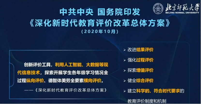 為了落實(shí)習(xí)近平總書記的指示,中共中央、國務(wù)院印發(fā)了《深化新時代教育評價改革總體方案》,為教育評價改革作出了具體的部署,涉及到改進(jìn)結(jié)果評價、強(qiáng)化過程評價、探索增值評價、健全綜合評價、建立科學(xué)的、符合時代要求的教育評價制度和機(jī)制。這樣一套新體系的建立需要做大量工作,尤其需要創(chuàng)新評價工具,利用人工智能、大數(shù)據(jù)等現(xiàn)代信息技術(shù),探索開展學(xué)生各年級學(xué)習(xí)情況全過程的縱向評價、德智體美勞全要素的縱向評價。這些具體落實(shí)措施也在《總體方案》中被明確提出。