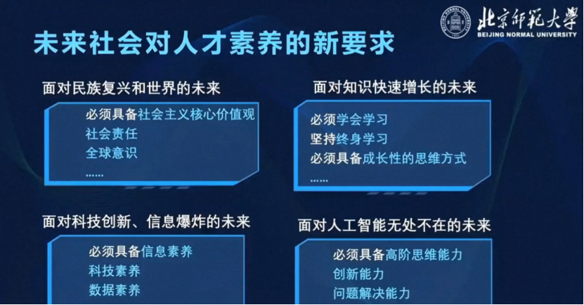 未來社會對人才素養(yǎng)在很多方面都提出了新的要求。無論從民族復(fù)興的角度,還是從科技發(fā)展、社會經(jīng)濟(jì)發(fā)展的角度,未來社會都對下一代的價值觀、社會責(zé)任感、全球意識、學(xué)會學(xué)習(xí)、高階思維、創(chuàng)新能力、信息素養(yǎng)等等方面提出了許許多多具體的、更高的新要求。