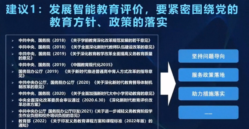 建議1:發(fā)展智能教育評價,要緊密圍繞黨的教育方針、政策的落實(shí)