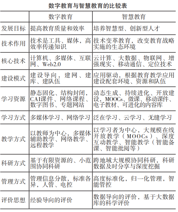 智慧教育在發(fā)展目標(biāo)、技術(shù)作用、應(yīng)用的核心技術(shù)、建設(shè)模式、學(xué)習(xí)資源、學(xué)習(xí)方式、教學(xué)方式、科研方式、管理模式、評(píng)價(jià)指導(dǎo)思想等方面與傳統(tǒng)數(shù)字教育表現(xiàn)出諸多的不同(見(jiàn)下表),總體呈現(xiàn)智能化、融合化、泛在化、個(gè)性化與開(kāi)放協(xié)同的特征與發(fā)展趨勢(shì)。