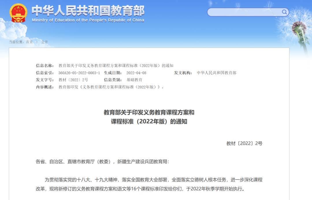 2022年4月,教育部印發(fā)《義務(wù)教育課程方案和課程標(biāo)準(zhǔn)(2022年版)》,本次修訂堅(jiān)持以習(xí)近平新時(shí)代中國(guó)特色社會(huì)主義思想為指導(dǎo),全面貫徹黨的教育方針,落實(shí)立德樹人根本任務(wù),對(duì)義務(wù)教育課程進(jìn)行了整體設(shè)計(jì)和系統(tǒng)完善。