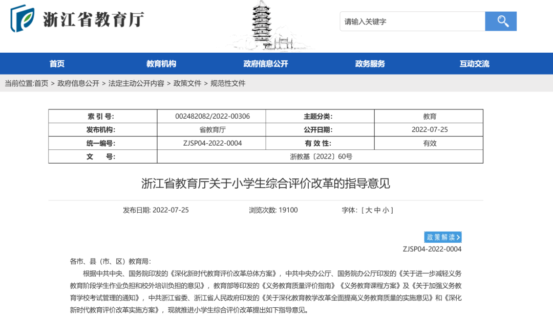 2022年1月,教育部印發(fā)《普通高中學(xué)校辦學(xué)質(zhì)量評(píng)價(jià)指南》。在學(xué)生發(fā)展方面,包括品德發(fā)展、學(xué)業(yè)發(fā)展、身心健康、藝術(shù)素養(yǎng)、勞動(dòng)實(shí)踐等5項(xiàng)關(guān)鍵指標(biāo),旨在突出五育并舉、全面發(fā)展,強(qiáng)調(diào)重素質(zhì)、重能力要求。2022年7月,全國(guó)首個(gè)針對(duì)小學(xué)學(xué)生評(píng)價(jià)的改革文件《浙江省教育廳關(guān)于小學(xué)生綜合評(píng)價(jià)改革的指導(dǎo)意見》發(fā)布,該文件明確了小學(xué)生綜合評(píng)價(jià)內(nèi)容,建構(gòu)了“五育融合”的評(píng)價(jià)體系。