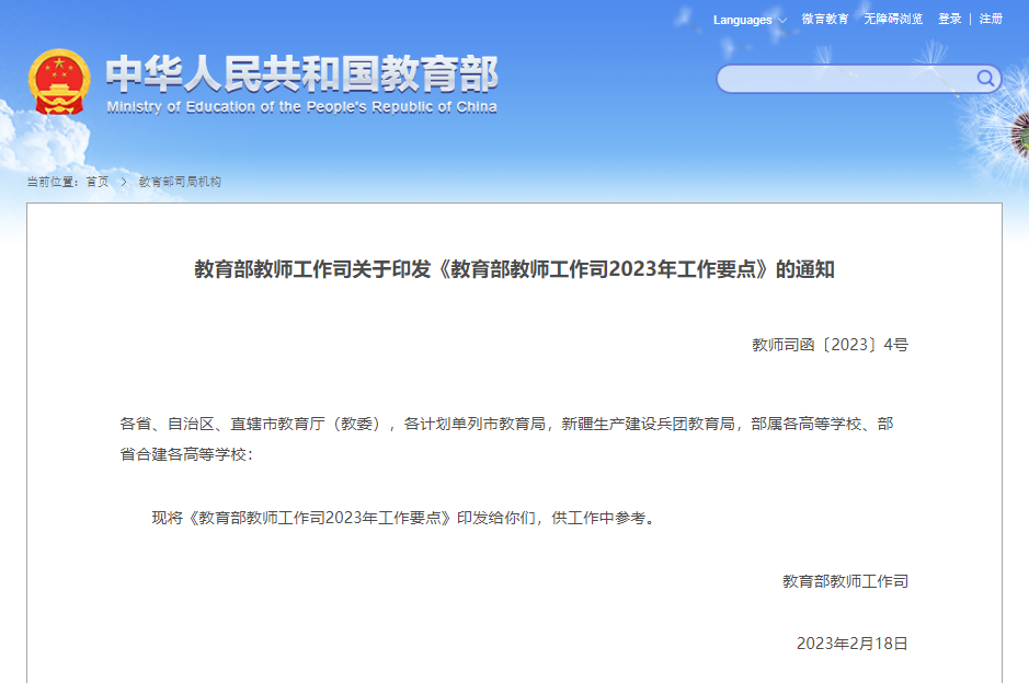 2023年是全面貫徹落實黨的二十大精神的開局之年。教師工作總體要求是:以習近平新時代中國特色社會主義思想為指導,緊緊圍繞深入學習貫徹黨的二十大精神這條主線,認真貫徹落實習近平總書記關于教育的重要論述特別是關于教師隊伍建設的重要指示批示精神,深刻領悟“兩個確立”的決定性意義,增強“四個意識”、堅定“四個自信”、做到“兩個維護”,全面貫徹黨的教育方針,落實立德樹人根本任務,深刻學習領會教育、科技、人才一體化部署要求,將教師作為教育發(fā)展的第一資源,加強師德師風建設,培養(yǎng)高素質教師隊伍,弘揚尊師重教社會風尚,全面深化新時代教師隊伍建設改革,以高質量教師隊伍支撐高質量教育體系建設,為推進教育現(xiàn)代化、建設教育強國、辦好人民滿意的教育提供有力的人力資源保障。