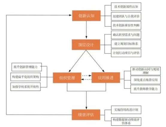 學(xué)校的數(shù)字化轉(zhuǎn)型是學(xué)校教育適應(yīng)外部數(shù)字時代發(fā)展環(huán)境和內(nèi)部創(chuàng)新人才培養(yǎng)模式的發(fā)展需求的過程。在學(xué)校數(shù)字化轉(zhuǎn)型的行動層面,如下圖所示,學(xué)校組織應(yīng)能克服技術(shù)創(chuàng)新帶來的焦慮,通過創(chuàng)新認(rèn)知提升學(xué)校組織的創(chuàng)新性,根據(jù)學(xué)校轉(zhuǎn)型需求與學(xué)?,F(xiàn)狀水平的差距規(guī)劃學(xué)校數(shù)字化轉(zhuǎn)型的頂層設(shè)計(jì),圍繞應(yīng)用推進(jìn)與深化組織管理變革開展數(shù)字化建設(shè)實(shí)施,并構(gòu)建數(shù)據(jù)驅(qū)動的績效評估體系持續(xù)改進(jìn)數(shù)字化建設(shè),提高信息技術(shù)創(chuàng)新與現(xiàn)有學(xué)校建設(shè)之間的兼容性并能夠?qū)⒔逃齽?chuàng)新逐漸納入到日常教育教學(xué)業(yè)務(wù)實(shí)踐中,推動學(xué)校教育的變革與創(chuàng)新突破,最終實(shí)現(xiàn)學(xué)校教育的高質(zhì)量發(fā)展。