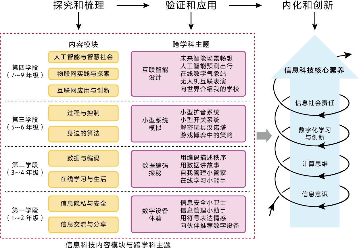課程標準明確了課程的名稱、課時設置、內(nèi)容結構和學業(yè)質(zhì)量標準,將信息科技落實為全國統(tǒng)一開設的獨立課程,更新了國家層面對課程整體方案的頂層設計。