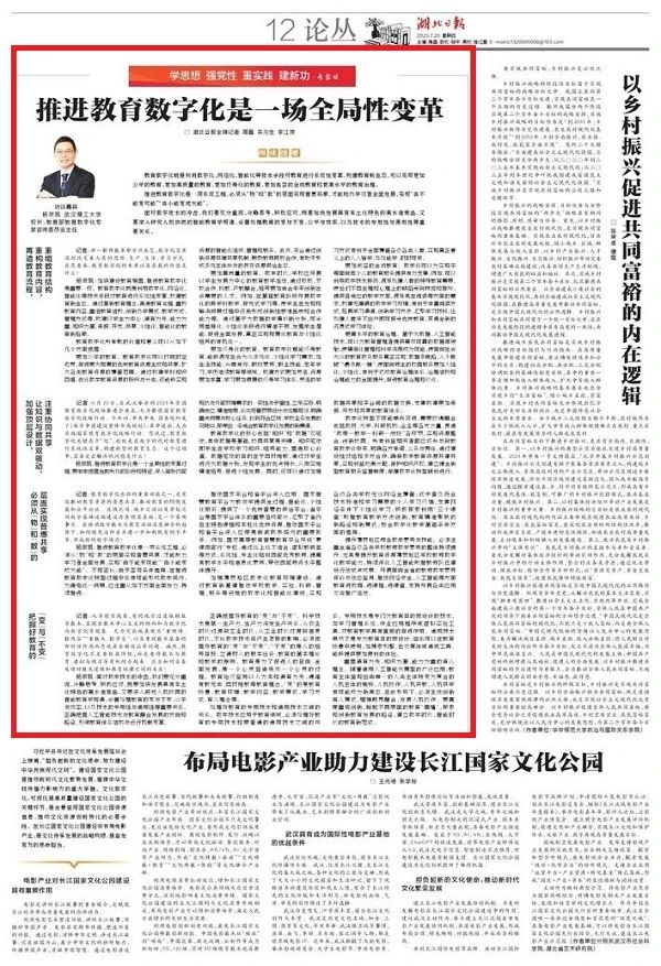 近日,湖北日?qǐng)?bào)以《推進(jìn)教育數(shù)字化是一場(chǎng)全局性變革》為題,專題訪談了武漢理工大學(xué)校長(zhǎng)、教育部教育數(shù)字化專家咨詢委員會(huì)主任楊宗凱。全文如下: