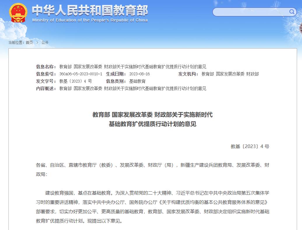 建設教育強國,基點在基礎教育。為深入貫徹黨的二十大精神、習近平總書記在中共中央政治局第五次集體學習時的重要講話精神,落實中共中央辦公廳、國務院辦公廳《關于構建優(yōu)質(zhì)均衡的基本公共教育服務體系的意見》部署要求,切實辦好更加公平、更高質(zhì)量的基礎教育,教育部、國家發(fā)展改革委、財政部決定組織實施新時代基礎教育擴優(yōu)提質(zhì)行動計劃?,F(xiàn)提出以下意見。