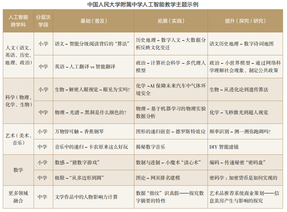 學(xué)科交叉融合是當前科學(xué)技術(shù)發(fā)展的重大特征,是新學(xué)科產(chǎn)生的重要源泉,是培養(yǎng)創(chuàng)新型人才的有效路徑,其核心是真實問題解決。人工智能本身是一個跨學(xué)科綜合的領(lǐng)域,交叉計算機科學(xué)、數(shù)學(xué)、生物學(xué)、神經(jīng)科學(xué)、認知科學(xué)、腦科學(xué)、心理學(xué)、社會學(xué)、哲學(xué)等,也符合STEAM教育的框架與理念。在具體教學(xué)中,要依托大視野、大概念、大思維,綜合考慮人工智能的學(xué)科基礎(chǔ)、核心思想、內(nèi)涵外延,挖掘人工智能與其他學(xué)科的交叉創(chuàng)新點。人工智能的跨學(xué)科特性不僅有利于促進學(xué)科整合,也催生了多學(xué)科教師聯(lián)合跨學(xué)科教學(xué)的新模式。例如中國人民大學(xué)附屬中學(xué)開發(fā)的“橫向跨學(xué)科縱向分層次”的人工智能+X跨學(xué)科課程體系,是打破學(xué)科界限、激發(fā)學(xué)生創(chuàng)新思維、發(fā)展學(xué)生高階能力的有益嘗試(見上表)。