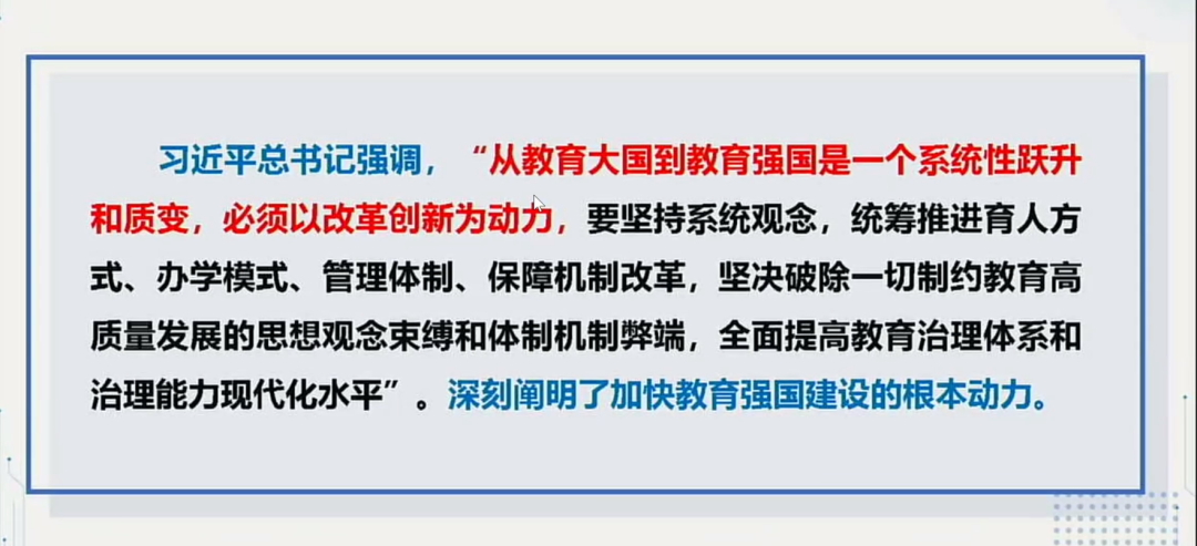 總書記在5月 29 日關(guān)于加快推進強國建設(shè)的主題講話里特別強調(diào),從教育大國到教育強國,是一個系統(tǒng)性的躍升和質(zhì)變,必須以改革創(chuàng)新為動力。