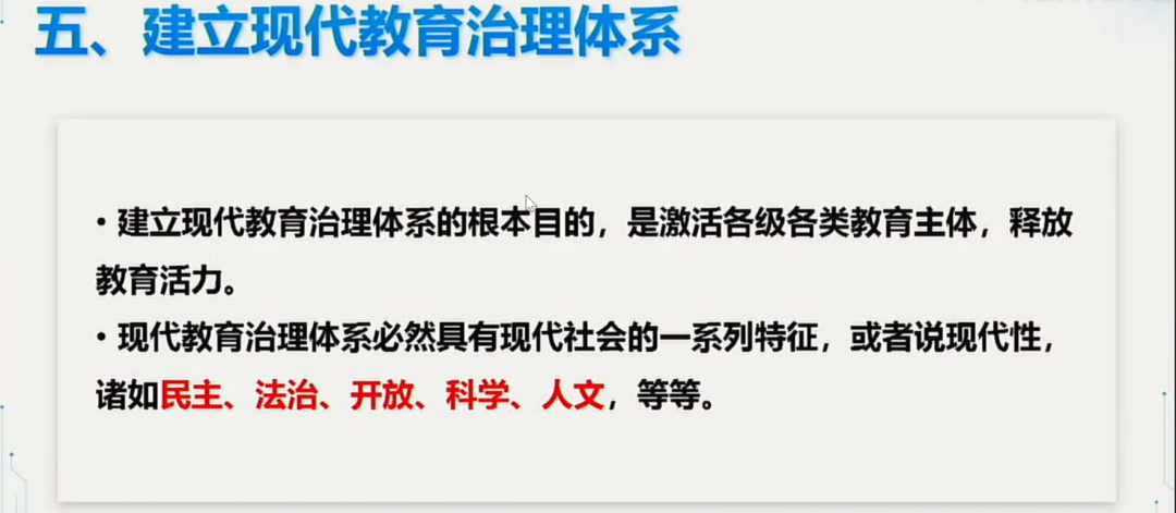 要加快建立現(xiàn)代教育治理體系。建立現(xiàn)代教育治理體系的根本目的是釋放教育活力,現(xiàn)在整個教育的活力不足,主體性和創(chuàng)造性不夠,建立現(xiàn)代教育治理體系的路徑有六個方面。
