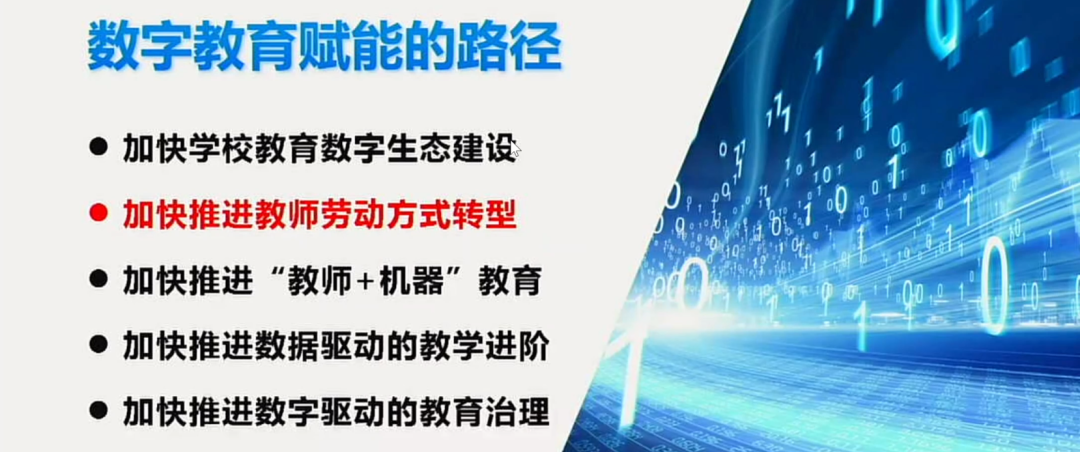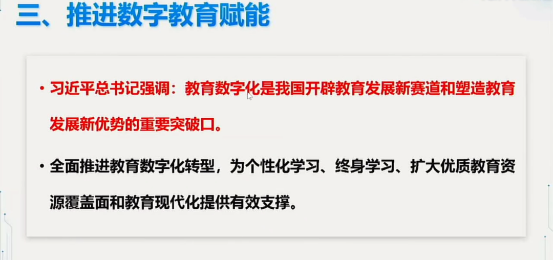 要推進數(shù)字教育賦能,這是我們推進教育強國建設(shè)的戰(zhàn)略選擇。總書記強調(diào),教育數(shù)字化是我國開辟教育發(fā)展新賽道和塑造教育發(fā)展新優(yōu)勢的重要突破口。如何通過數(shù)字教育賦能推動教育強國建設(shè)?這里有五個方面的考慮。