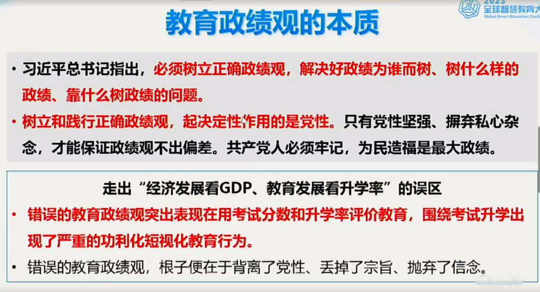 錯誤的教育政績觀突出的表現(xiàn)是總書記在 2018 年全國教育大會上所講的,用考試分數(shù)和升學率評價教育,圍繞著考試升學出現(xiàn)了嚴重的功利化、短視化行為。這是我們推動教育政績觀轉(zhuǎn)變的根本的價值輸出,說到底,教育的工具價值不能夠取代、弱化危害教育的本體價值。