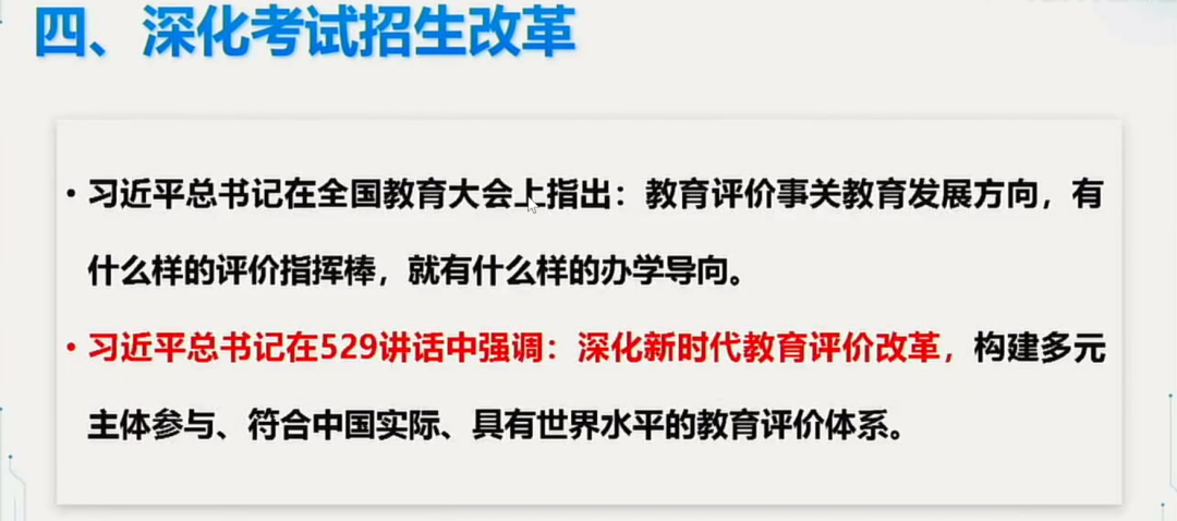 教育強國建設(shè)必須要深化考試招生制度改革。總書記反復強調(diào),教育評價事關(guān)教育發(fā)展的方向,有什么樣的評價指揮棒就有什么樣的辦學方向。