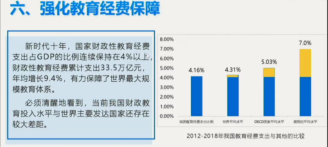 美國的高等教育財政性教育投入占 GDP 的比例是2.5%,我們國家只有 1.3%,所以我們必須要進一步強化教育投入的總量和強度,才能支撐教育強國建設(shè)。