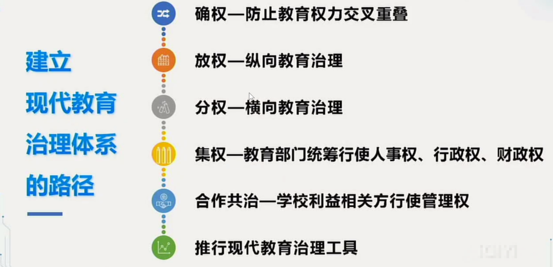 第一要確權(quán),進一步進行教育權(quán)力的科學性配置。防止教育權(quán)力的交叉重疊,提高治理效能,改變同一件事在不同部門重復管理、交叉重疊的治理方式;第二要放權(quán),縱向進行教育治理;第三是分權(quán),進行橫向教育治理;第四是集權(quán),教育部門、教育機構(gòu)要統(tǒng)籌教育人事權(quán)、行政權(quán)和財政權(quán);第五要合作共治,其中的關(guān)鍵是做到學校利益相關(guān)方行使管理權(quán),舉個例子,教師的職稱評審中,學校的領(lǐng)導層、校長、副校長占專家委員、評審委員會的比例不能超過三分之一, 三分之二必須是一線老師,讓教師的利益代言人來行使管理權(quán),通過合作共治使學校利益相關(guān)方行使管理權(quán),能夠提高治理的專業(yè)性和科學性;最后要推行一個現(xiàn)代教育治理工具,治理不能只是計劃、考核和評估,必須要推行一系列現(xiàn)代教育治理方式和工具,提升教育治理的效能。