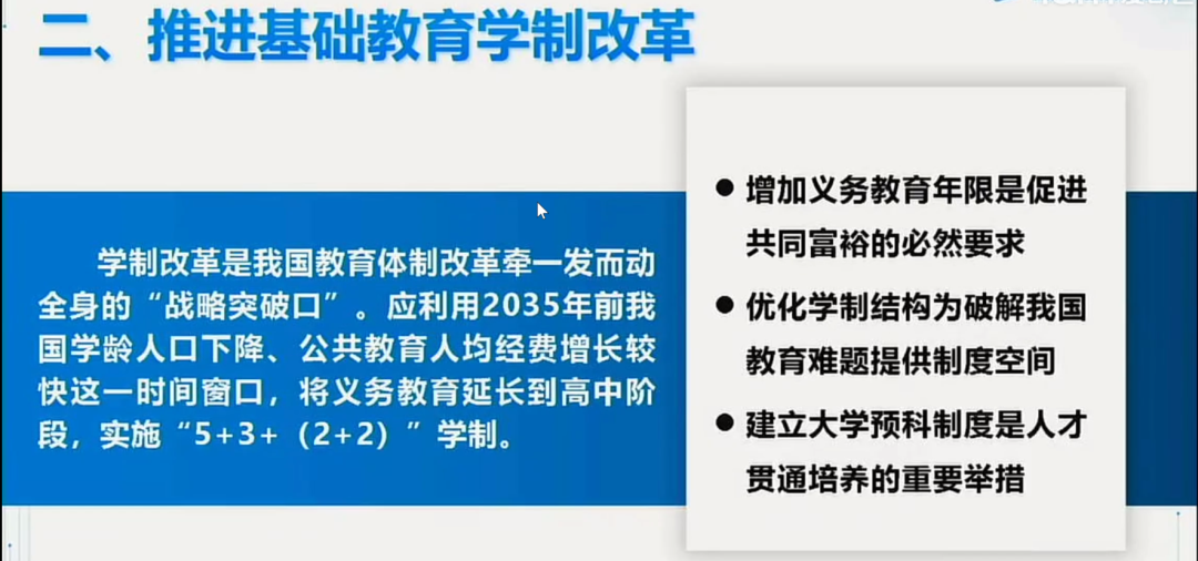 第二個重大的戰(zhàn)略選擇是優(yōu)化學制結(jié)構(gòu),為破解當前國家的教育難題提供制度空間。如何破解教育的內(nèi)卷的問題,如何破解當前的中考改革、教育公平等問題。