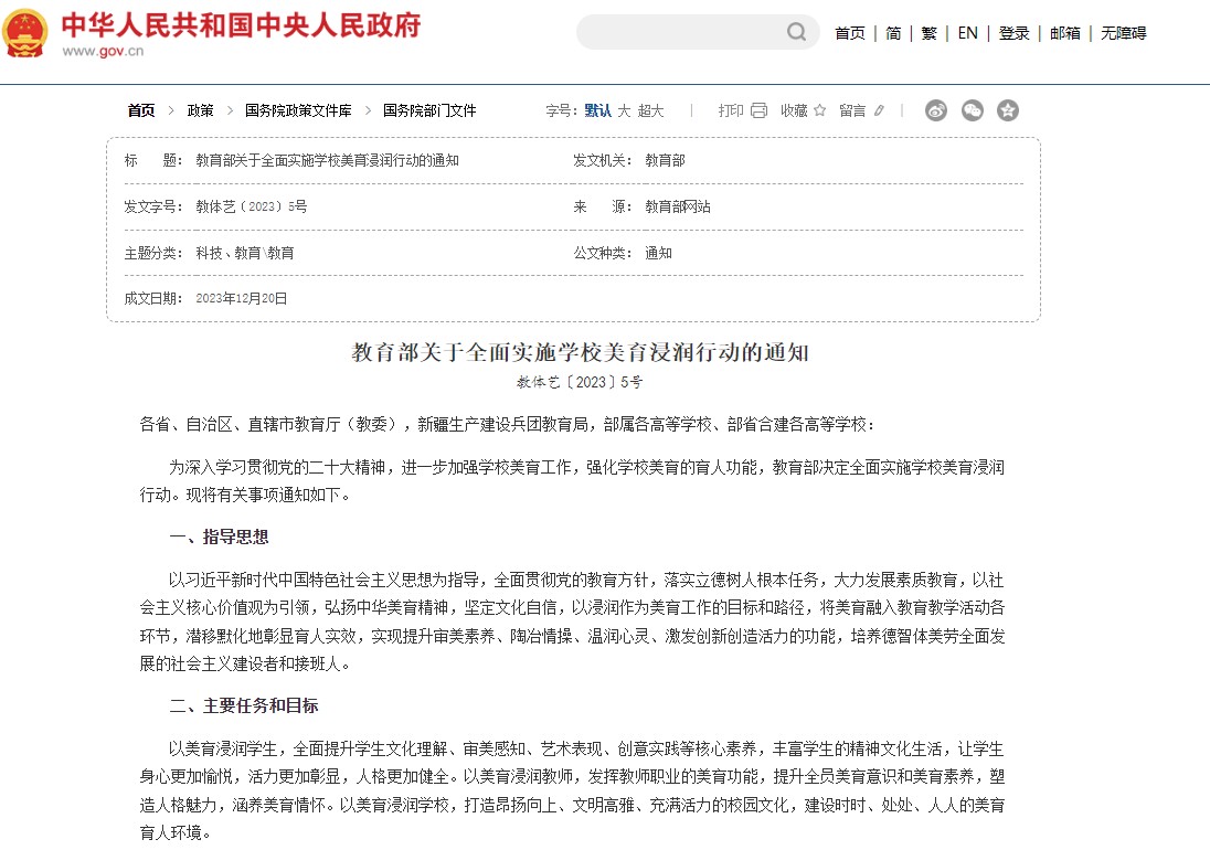 教育部印發(fā)《關于全面實施學校美育浸潤行動的通知》(教體藝〔2023〕5號),全面實施學校美育浸潤行動,包括實施美育教學改革深化行動、美育評價機制優(yōu)化行動等,進一步加強學校美育工作,強化學校美育的育人功能。此文件也為未來一段時間內(nèi),各個層面美育工作的開展指明了方向。加之之前《關于全面加強和改進新時代學校美育工作的意見》文件內(nèi)容,藝術素質測評的實施,有助于推動學校開足開齊藝術相關課程及促進教育教學改革相關工作。