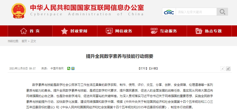 2021年,中共中央網(wǎng)絡安全和信息化委員會辦公室印發(fā)的《提升全民數(shù)字素養(yǎng)與技能行動綱要》指出要把提升全民數(shù)字素養(yǎng)與技能作為建設網(wǎng)絡強國、數(shù)字中國的一項基礎性、戰(zhàn)略性、先導性工作。