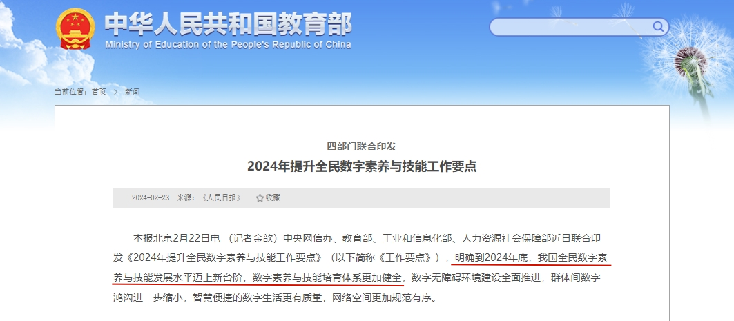 2024年2月,中央網(wǎng)信辦、教育部、工信部、人社部聯(lián)合印發(fā)的《2024年提升全民數(shù)字素養(yǎng)與技能工作要點》明確要求:要建立更加健全的數(shù)字素養(yǎng)與技能培育體系。中小學是培育該體系的最好發(fā)力階段,也是朝正確方向發(fā)展的關鍵階段。學校是青少年數(shù)字素養(yǎng)和技能提升的主陣地,教師是帶領學生提升數(shù)字素養(yǎng)與技能的主要責任人。