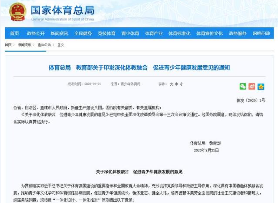 體育總局教育部關(guān)于印發(fā)深化體教融合促進(jìn)青少年健康發(fā)展意見的通知
