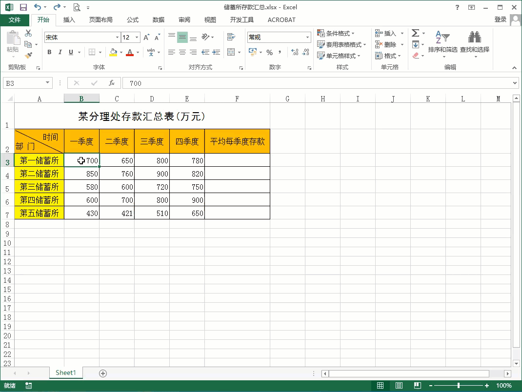 選中單元格區(qū)域A2:F2后,在開始選項卡中的字體功能區(qū)中,將填充顏色設(shè)置為橙色。選中單元格區(qū)域A3:A7后,將填充顏色設(shè)置為黃色。