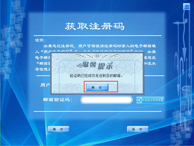 ③等待彈出發(fā)送成功的提醒后,打開郵箱,查找驗證碼郵件并將驗證碼填寫到“郵箱驗證碼”后面的白色框中,點擊“確定”,之后郵箱會再次收到一條包含注冊碼和流水號的郵件,再次安裝注冊學考評即可使用。