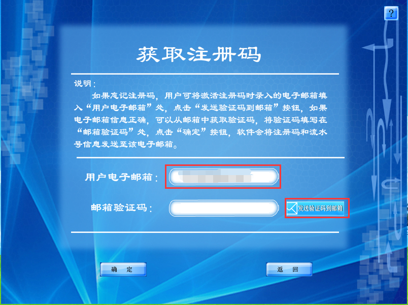 ②在彈出的“獲取注冊碼”界面輸入第一次注冊時填寫的電子郵箱,然后點擊“發(fā)送驗證碼到郵箱”按鈕,
